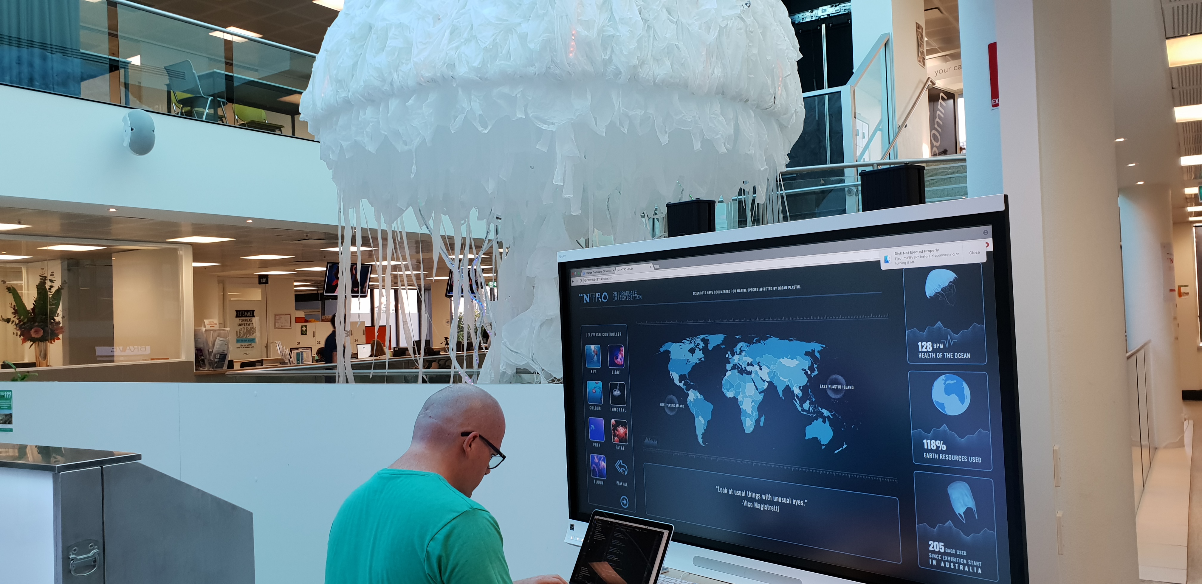 The Digital Media students at Billy Blue College of Design in Brisbane created the large-scale, interactive installation 'Beyond the Deep'which focused on disruptive messaging, and creates a beautiful visual spectacle from dangerous and unwanted materials.